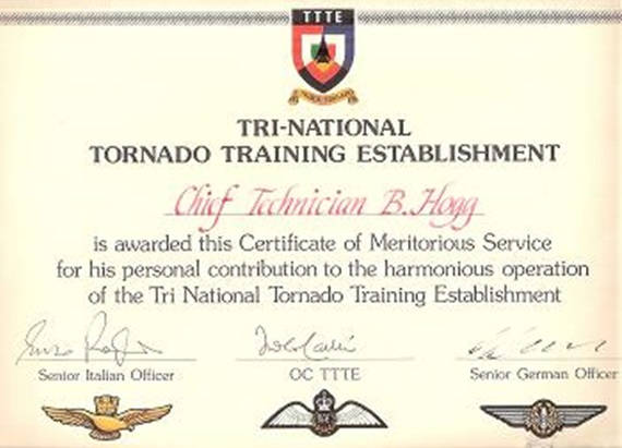 The Tornado played a significant part in my life not only in the RAF but many years later in my civil life. Being in charge of the whole team of personnel, inspecting and accepting the Tornado, it helped me to develop my management skills as well as my technical skills. It also allowed me to invent many types of equipment to make the servicing of the Tornado much easier for which I received Certificates of Merit and some cash in the following year.