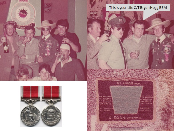 Once a year the Squadron were sent to Decimomannu in Sardinia, Italy (Deci), to allow the Pilots to experience Live Firing of Weapons from the Harrier Aircraft using the Inertial Navigation Attack System (INAS) that I and my men were responsible for. This also gave the Armourers chance to practice Loading Live Weapons on the Aircraft. We traveled from Gutersloh with our Specialised Testing Unit in a Hercules C130 Aircraft for about 4 hours which was quite noisy and uncomfortable. The Harrier Aircraft had a Moving Map Display, which I had to load a special 35mm map for navigation to Decimomannu and the pilots had to select this at 45 degrees North. However our Boss, Wing Commander Chaplin, which I had a very good working relationship with, never used the Map. We all new he was affectionately known as a ‘Pilot who flew by the seat of his pants’. At Deci Wing Commander Chaplin invited me to fly with him in the Harrier Training Aircraft (known as the ‘T Bird’) back seat, however I hated flying so I did not accept his offer. Just prior to my last visit to Deci I was awarded the British Empire Medal (BEM) which was really for the hard work that was put in by all on 4 Sqn. My great Avionics Team decided to do a ‘This is your Life skit’ and carved a wall with 4 Sqd Avionics and team names in Deci.