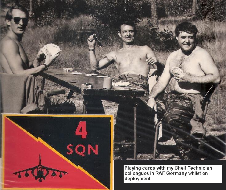 When the Exercise Alerts went off normally very early morning, the 4 Sqn Vehicles had to transport everything from Gutersloh to there specific Site. I planned all of the Vehicles Loads which included almost every equipment we had on the Sqn, Drivers and Personnel responsible for loading each item onto the Vehicles and where Personnel would sit in Vehicles. By the way this included the Beer Lorry. Although I was the Supervisor for all of this I preferred to Drive the 4 Ton Lorry with a 5 Ton Trailer with Air and Nitrogen Bottle Trolleys on Board, not a Landrover. We traveled in Convoys on per-determined routes to the Sites, however, when we reached the Sites it was a nightmare parking and camouflaging the vehicles especially if it was raining with mud all over the place. Then we had to unload a lot of equipment some of which was very heavy especially Gun Cocking Trolleys. However, that was part of the ‘Fun’ of a Deployment and morale was high. When the weather was good and we could have a break during the exercise we would get together and play cards. Like Robbie Airframe (left), Alex Electrician (right) and myself Avionics (centre).
