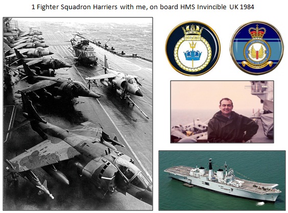 I arrived at HGSS on the 7 April 1983. The Instructional Staff include RAF and two RN personnel. They were very helpful on arrival and knew who I was and my background in the Avionics Bay in Wittering and my time on the Harrier Force with 20 Sqn and 4 Sqn. I was also welcomed by the RAF Wittering Station Commander Group Captain Dodworth as HGSS was located in the Headquarters building. Just after arriving at HGSS, I was awarded the Air Officer Commanding- In- Chief Commendation for Meritorious Service to RAF Strike Command. Only a few days later I was contacted by Support Command saying that they had been contacted by the Harrier Force in Germany to rapidly improve the quality of Harrier Avionics Personnel Technical Training. I was told that I should consider this situation and provide a plan urgently to address the situation. After consulting with the Wittering Station Commander he agreed to installing a Aircraft Power Supply Generator in HGSS to allow a disused INAS Training Rig with actual equipment to be powered just like a Harrier System. This allowed me to connect the specialised Test Equipment which my team used in Germany. I also decided to reduce the Training Time from 13 weeks to 7 Weeks for personnel working on Aircraft concentrating on Fault Finding. The responses some time later from the Harrier Force was very positive. During my time at HGSS I was selected to lead a Team from 1 Sqd and 4 GR3 Aircraft to operate from HMS Invincible to find a better way to Align the INAS which I did over 4 weeks at sea. Soon after I was awarded a Certificate of Merit for an Invention on the Tornado and the Station Commander arranged for a Tornado flown into RAF Wittering to be parked next to a Harrier GR3. On a lighter note we used to have HGSS Charity Draws with Group Captain Dodworth pulling out my ticket number. In May 1985 I was informed I would be posted to 20 Sqn operating Tornado Aircraft at RAF Laarbruch in Germany. So this would be the last time I would be involved with the Harrier Aircraft and Harrier Force in the RAF. I resigned from the RAF after 25 years service in June 1986 to Join British Aerospace and then Start my own business, Computeriesd Training Systems Ltd, which designed and developed Computer Based Training for the RAF Harrier and Tornado Aircraft.